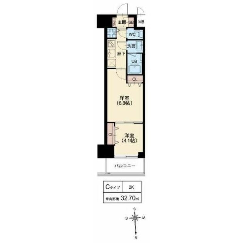 | 間取り / 広さ | 2K / 32.7㎡ | 所在階数 | 4階 | 向き | 北 |