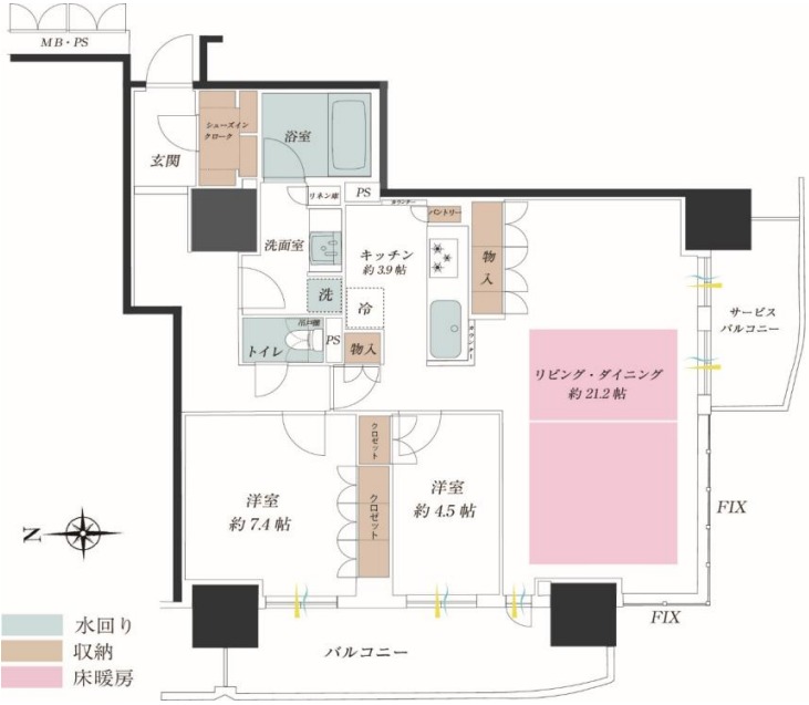 お部屋の設備サービス 角部屋、床暖房、クローゼット、シューズボックス、室内洗濯機置き場、バルコニー、フローリング