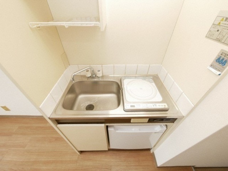 IHの1口コンロで、下には冷蔵庫、シンク上には簡単な食器を置いていただけるスペースもあります。