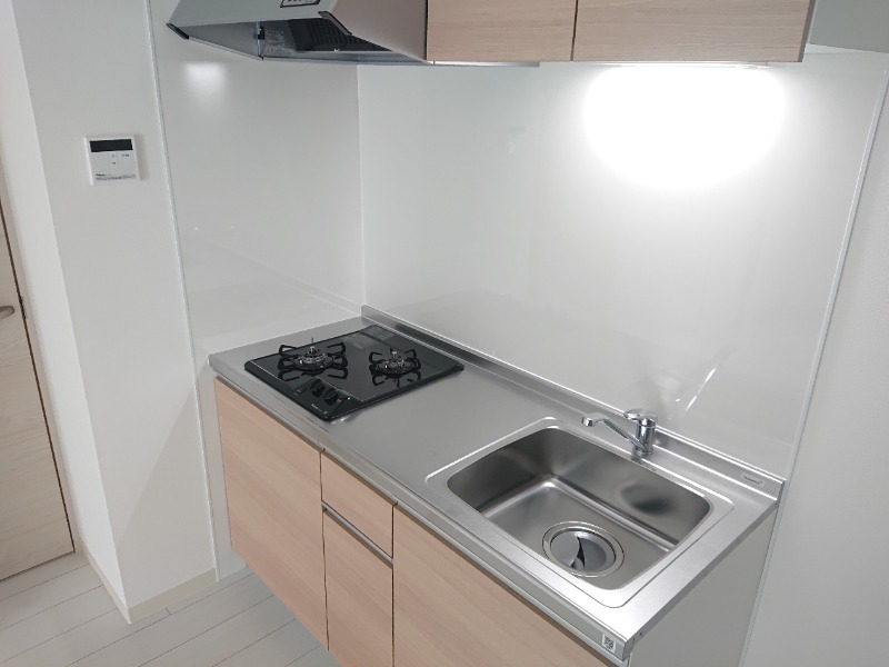 キッチンは2口コンロが設置されている、明るい木目調のデザインとなっております♪