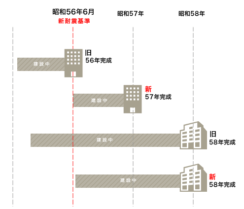 木造なら完成まで最低半年(注文建築ように工期が長くなるとそれ以降)かかるので昭和56年9月以降〜が新耐震基準。