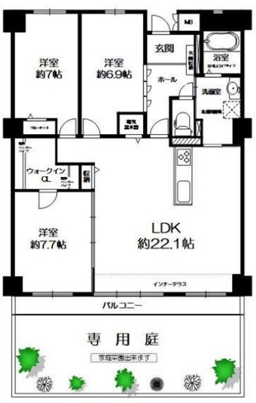 | 共益費:- | 専有面積:94.81㎡ 間取り詳細:LDK 22.1帖,洋室 7.7帖,洋室 7帖,洋室 6.9帖 |