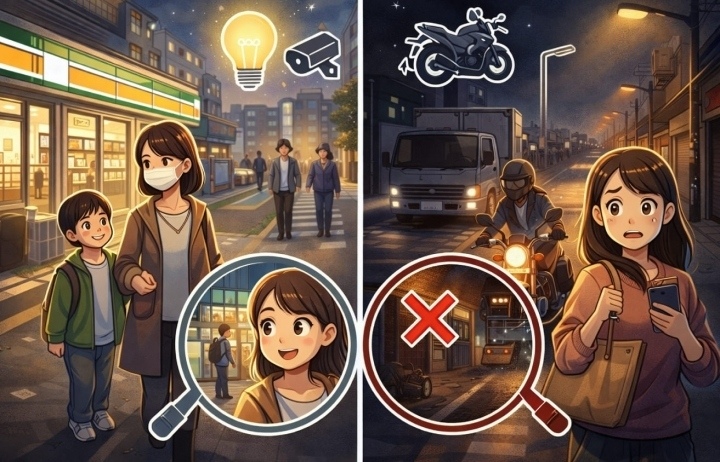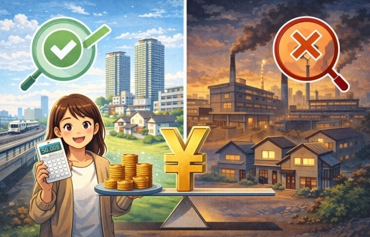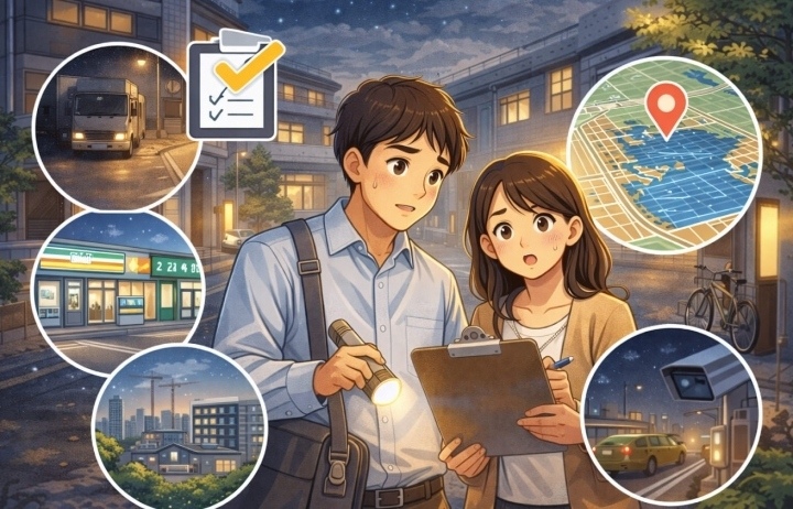 物件選びで最も重要なのが「夜間の現地確認」です。昼間は静かに見えても、深夜になると国道からの騒音や周辺の雰囲気が大きく変わることがあります。内見は必ず昼夜2回実施し、騒音レベル・街灯の有無・周辺の人通りを自分の目で確かめてから判断してください。